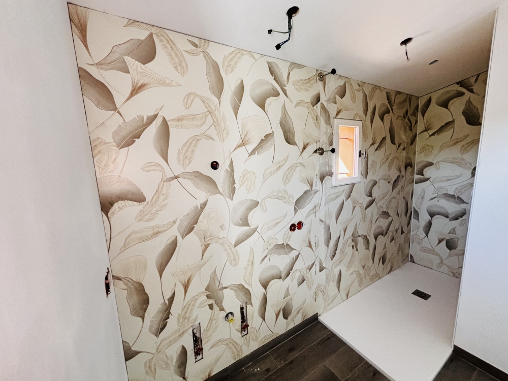 A LORGUES la rénovation de la salle bain est terminée et la pose des panneaux muraux s'est bien passée .